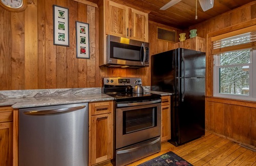 Hardwood floors and wood accents create the perfect cabin-style ambience throughout the main level. It is easy to imagine gathering with loved ones in the great room to watch a favorite movie on the Blu Ray or curl up in front of a crackling fire in the massive stone fireplace. During the summer months, central AC will keep you cool.