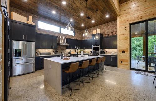This new luxury retreat is a custom built and professionally designed work of art! The Sky's The Limit says it all! As you enter the cabin through an oversized front door, you will pass a staircase with a cozy sitting/reading nook nestled in the corner in front of an over-sized window. Throughout the cabin, you can observe nature's beauty no matter where you turn. All of your expectations will soon be surpassed as you enter into the immaculate, large, open living area withwalls of windows, plenty of seating, and a big screen TV. The floor to ceiling built-in gas fireplace wrapped in metal-look large format tile, draws your eye up to the soaring high ceilings creating an atmosphere where industrial chic meets modern luxury. From your cozy spot on the couch, you can watch the action in the game room down the hall through the myriad of windows, gaze out at the pond, or if you choose to walk around, you can access the deck from either side of the living room. As you enter the well-appointed and exquisitely designed kitchen, you will find this property was curated for a master chef! The kitchen has a coffee bar with a Keurig coffee maker with starter K-Cups, creamers, and sweeteners, a double oven, a microwave drawer, 2 dishwashers, 2 refrigerators, (one in the kitchen and one in the pantry) a griddle, an air fryer, and an amazing commercial-grade 6 burner gas stove top. Between the kitchen and living room you will find a wet bar with a wine fridge and ice machine. The dining room has a large table with seating for 12 as well as additional seating for 5 more at the kitchen island. You can also access outdoor seating through the kitchen onto the expansive deck.