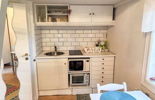 "Skyberga Torp Lilla stugan", 1-room house 10 m2. Bright, very comfortable and cosy furnishings: open living/dining room with open-hearth fireplace. Kitchenette (2 induction hot plates, freezer, electric coffee machine) with dining table. Shower/WC. Heating. Upper floor: (steep stair) sleeping alcove with sloping ceilings with 1 double bed (180 cm, length 200 cm). Beautiful view of the countryside and the forest. Please note: non-smoking house. Maximum 1 pet/ dog allowed. Private entrance, smoke alarm, fire extinguisher. Instead of an enclosed bedroom, some sleeping areas are located in an open-plan area (gallery, alcove, etc.).