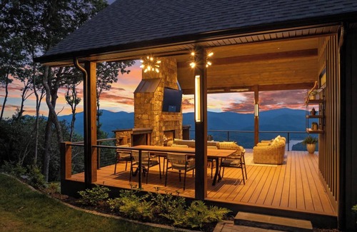- Covered porch with wood-burning fireplace, 85" outdoor TV, and dining for 10+