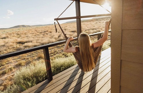 Our custom made casita has been thoughtfully built and designed by us for those looking for that extra glamping comfort. 8 skylights line the roof to make the most of sky watching and stargazing. Our only solar powered unit has AC/heat, outlets, a mini fridge and a kettle. This unit can sleep up to 4 guests with a king bed, a queen bed in the loft, a cozy couch, large dining table and large windows. Adirondack Chairs, hammock swings and a porch swing wrap around the 3 sides of the private deck.