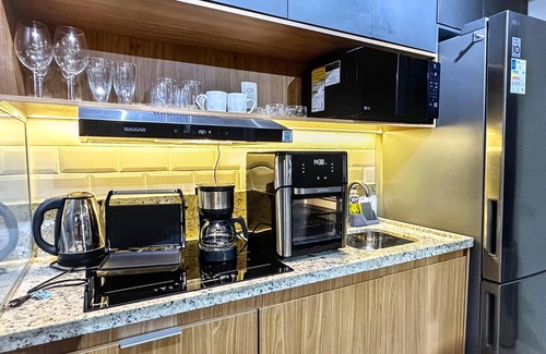 Modern studio in the heart of Rio! Enjoy a queen bed, 55” Smart TV with Netflix, rain shower, full kitchen, fast Wi-Fi, and a private balcony. The building features 24/7 security, pool, gym, coworking, and laundry. Perfect for digital nomads, business travelers, or couples seeking comfort at 2 minutes from the metro (Uruguaiana) and Porto Maravilha.