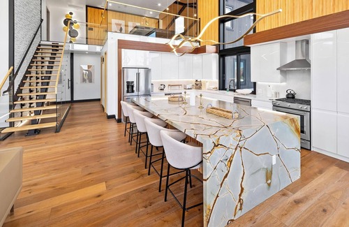 The massive, ultra-modern chef’s kitchen is equipped with everything you need to cook a family style meal or host friends for cocktails & hors devours. The stunning kitchen features an oversized center island with waterfall countertops that doubles as a breakfast bar with 5 barstools. Beautiful decorative hanging light fixtures compliment the kitchen design and stainless-steel appliances plus other amenities like Breville Espresso Maker, dishwasher, toaster and microwave complete your chef's kitchen experience.