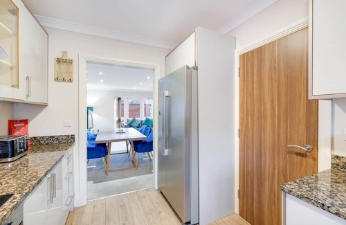 4 Bedroom 3 Bathroom house with parking just a minute from the town centre, the fully equipped kitchen, lounge, and dining area with table will guarantee you a comfortable stay, with Smart TV and free Wi-Fi. The downstairs has a kitchen and open plan lounge and diner leading to a private garden. The 3 bedrooms are located on the 1st floor, 2 bedrooms are laid out with king size beds and built-in wardrobes with one them benefiting from an en-suite.