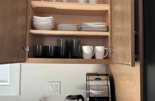 The kitchen is fully stocked for culinary adventures—gas stove, fresh-grind coffee maker, tea options, and a breakfast bar for your morning rituals or late-night ramen. The spa-like bathroom is your personal wellness retreat, complete with a walk-in shower with a rain head and body jets, plus a deep tub for soaking your sightseeing feet.