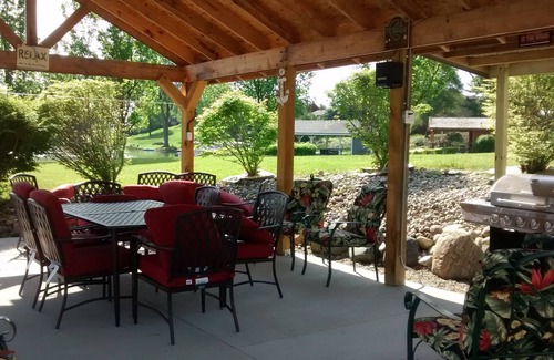 After Dinner, enjoy a game of billiards or Ping Pong, Foosball, Horseshoe Toss, badminton, soft-tip darts, weight machine (All available in the game room). Take a Dip in the indoor Pool, or play Volleyball in the Huge Yard, Watch Tv Or Listen to your Favorite music on any of the provided Stereo Systems (family room, lower level, pool room, pavilion).