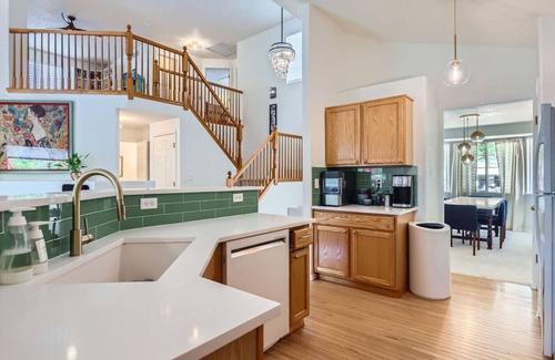 The whole family can relax in this spacious 2,600 sq. ft. home. This 3-story house features 4 bedrooms, 4 bathrooms, and sleeps 9. The open living room has vaulted ceilings and great natural light. The master bedroom has a king bed, and the master bath includes a Jacuzzi tub. 2 queen beds, a full, and a twin offer plenty of sleeping space. A dedicated office w/ two desks keeps work easy. Enjoy a big backyard & back patio with outdoor dining. Centrally located, it's just 20 minutes from Boulder.