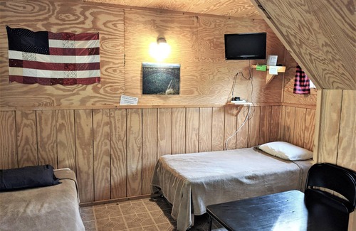 2 twin beds on the first floor, 6 twin beds on the second floor. We always stock our cabins with all bed linens, bathroom towels, soap, and toilet paper. We are also pet friendly. The kitchenette has a two-burner electric stovetop built in, microwave, coffee maker, and a full-size refrigerator/freezer.We supply 2 small pots and 1 smallpan, paper plates, paper bowls, plasticware dishes, plastic cups, coffee and styrofoam coffee cups. There is a television but no satellite or cable TV. Feel free to bring your own DVD player, games, etc. and cords as we do not supply cords for devices. Free basic wifi - however not good for streaming. Outside, there is a covered porch with benches, your own picnic table and fire ring. You can cook on the fire ring and later push aside the grate to sit around the fire. Firewood is for sale on the porch. Guests have access to the parking lot and the yards behind the cabins. Feel free to bring a Frisbee!