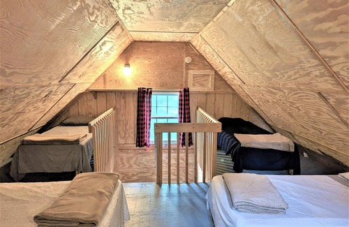 2 twin beds on the first floor, 6 twin beds on the second floor. We always stock our cabins with all bed linens, bathroom towels, soap, and toilet paper. We are also pet friendly. The kitchenette has a two-burner electric stove top built in, microwave, coffee maker, and a full-size refrigerator/freezer.We supply 2 small pots and 1 smallpan, paper plates, paper bowls, plasticware dishes, plastic cups, coffee and styrofoam coffee cups. There is a television but no satellite or cable TV. Feel free to bring your own DVD player, games, etc. and cords as we do not supply cords for devices. Free basic wifi - not good for streaming however. Outside, there is a covered porch with benches, your own picnic table and fire ring. You can cook on the fire ring and later push aside the grate to sit around the fire. Firewood is for sale on the porch. Guests have access to the parking lot and the yards behind the cabins. Feel free to bring a Frisbee!