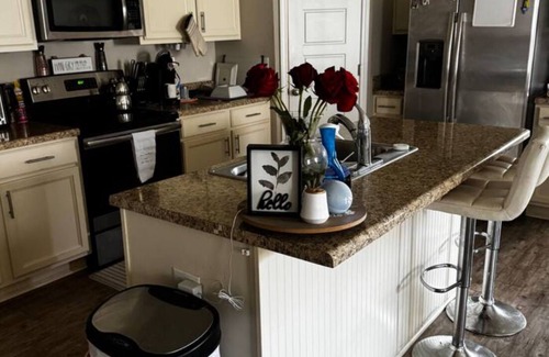 The cozy living room also offers an additional 2 leather sofas for extra comfort. Guests can enjoy amenities like a hair dryer, AC, heating, outdoor projector with 120 inch screen, Grill, fire-pit, 80 inch TV with 5.1 Dolby surround home theater system, lights being controlled by voice during their stay. Make your holiday one for the books with a stay at our place.