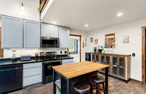 Faewild's faery charm and cozy atmosphere is the ideal place to gather with friends and family. With 3 bedrooms and 2 full bathrooms, it has room for 6-8 depending on how cozy the group is. Situated on a rise in the middle of the tall pines in Sherwood Forest Estates, it sits on its own acre with beautiful forest views. This property has it all: fully equipped kitchen, gas fireplace, loft, an office area with stand/sit desk, comfortable office chair, keyboard, mouse and monitor for you when you need to do some work while at the cabin. Outside the garage is available for guests - a real plus when it's snowing! A downstairs deck with outdoor dining table and Weber grill, and whimsical touches all over the land and trees come alive with faery lights at night. Upstairs there is a deck as well with commanding views of the trees. Full sized washer and dryer, and High-speed internet plus high-def smart television round out the list of amenities. -