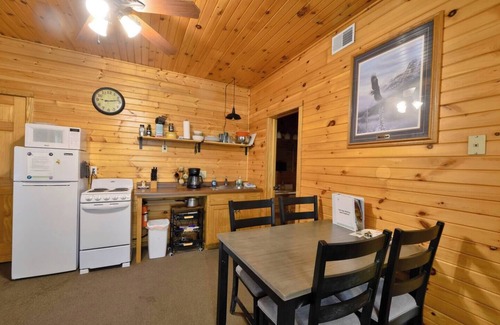 The cabin features an open plan living/dining/kitchen area with a comfy couch & chair, dining table with seating for four, fully-outfitted kitchen, and high-speed wifi that makes streaming your favorite content on the tv or your preferred device a breeze. The primary bedroom has a queen bed and second bedroom has two twin beds (all bedding & mattresses are also brand new!). The full bath has a combo tub/shower. The cabin's set up is perfect for families as well as small groups of friends.