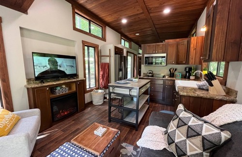 This secluded tiny house blends nature and fun design into a seamless indoor/outdoor flow. Plenty of space and natural light give Snuggle Up the unusual feeling of a larger space compared to most tiny houses. While the outdoors takes center stage, the interiors contribute a cozy lodge vibe that is simply superb. You might never want to leave! Come experience the vacation you've always imagined at Snuggle Up!