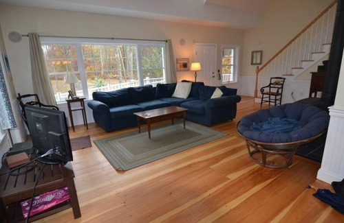 Lovely 12 year old completely accessible, open and sunny, home sleeping 10 on first and second floor plus a finished basement with two bedrooms and a bath (available as necessary and only upon request for large groups- no heat) . First floor master with roll in shower and second bedroom with hall bathroom. On the second floor, one bedroom with two twins and one with a queen and a set of bunks. In the basement, one bedroom with a queen and another with a bunk. Classic cedar shake style with wood stove, hardwoods throughout, air and heat as well as screened in porch and outdoor shower. Solar and Geothermal. Three mile lovely bike ride, drive or walk to the beach. Close to wonderful beaches, woods/hiking, dining, biking! What more could you want! . Great deck and fire pit as well as space for outdoor games!