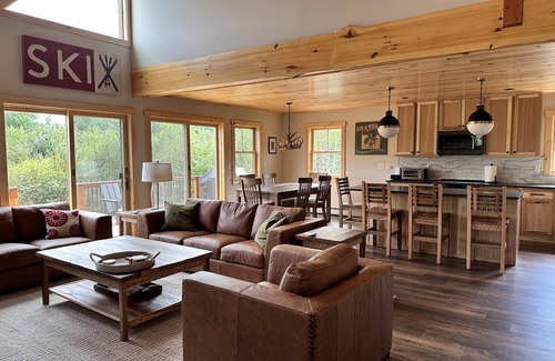 Our spacious living area features an inviting gas fireplace, perfect for warming up after a day on the slopes. Gather around and enjoy the fire as you watch your favorite movies or football game on the 70" TV. It's the ideal spot to unwind with friends and family, creating cherished memories in the heart of the lodge.