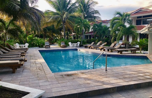 Paradise Villas is located on the northern edge of San Pedro town on Ambergris Caye. It’s a small boutique complex that has 24 total units in a horseshoe around a beautiful pool in the middle and the gorgeous turquoise Caribbean Sea right in front. The grounds are lush with tropical vegetation and many varieties of flowers. Pathways are hard packed sand and no cars can enter the grounds only golf carts which is the main transportation on the island. It is beautiful. There is a dock out front that has a great swimming area.