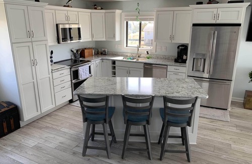 Our home was beautifully renovated in 2018. Which included a brand new kitchen, new floors throughout, new showers, and new deck. Our philosophy is that if there's something we would need when staying there, our guests will need it too. You will find a kitchen completely stocked for cooking, baking, and grilling (with appliances, such as a split double oven convection range, a microwave, a crockpot, griddle, hand mixer, popcorn maker, rice maker, Keurig, coffee maker, electric tea kettle, etc.). Plus, access a variety of games, a sewing kit, a first aid kit, iron and ironing board, luggage racks, a chair in each bedroom, and many other amenities. After a long day enjoying all that the Outer Banks offers, you can sit back relax and watch shows on the 75" Smart TV. The home offers WiFi and the television is equipped with an Amazon Fire TV Stick, there is no cable television.