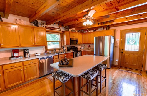 A 2,600 Sq. Ft. Southern Log Home located on its own 10 Acres of the Ranch. Just a short walk to the Main Ranch House. The Guest House has (4) Bedrooms each with King Beds; a Den/TV Room with a pull out Futon Sofa; Large Living Room with Sectional Couch and Big Screen TV; Eat-In Kitchen; Dining Room that seats (6); and (2) Bathrooms each with a Tub/Shower. There are front and side porches overlooking the rolling Tennessee Countryside. A back deck seats (8) and has a propane BBQ.