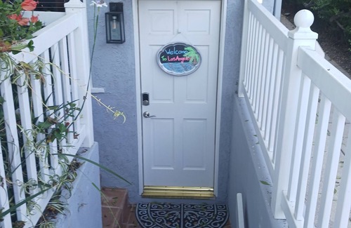 Deluxe master suite with queen size bed, 42" T.V. and en suite bathroom occupy the entire lower level of the home, which is shared with the owner who lives upstairs. The suite has a separate front entry door and is separated from the upstairs by a stairway to a locked door. There is a large custom closet with a mini kitchen in it containing a refrigerator, microwave, Keurig coffeemaker, electric kettle, and a blender. Master bathroom features a large jetted tub with a spacious, separate shower and built-in hair dryer. There are robes, slippers, and beach towels for your use in the closet and drawers of the bathroom. Additionally, the shared outdoor patio area includes laundry facilities, an outdoor kitchen, refrigerator, and dining table overlooking the pool. Please note parking is street parking on one side of the street.