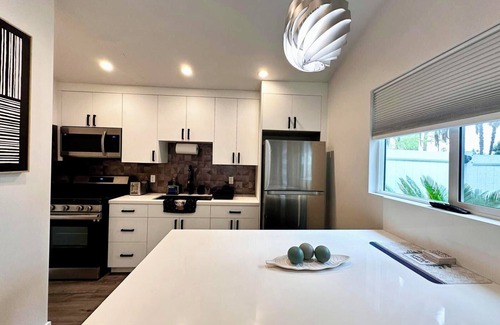 This beautifully furnished 1-bedroom guesthouse offers modern comfort in a peaceful residential setting. With a spacious layout, the unit features a fully equipped kitchen and bathroom, a queen-sized bed, comfortable sofa, smart TV, in-unit washer and dryer, and a relaxing outdoor seating area. Enjoy the privacy of your own entrance and the convenience of ample street parking—perfect for easy, comfortable living.