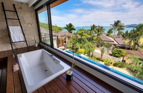 Step into modernity intertwined with traditional Thai craftsmanship – hand-carved doorways, ceramic tiling, and a fully equipped kitchen for culinary exploration. Baan Maliwan's open-plan design seamlessly integrates the beachfront bay of Bophut into every corner, inviting you to embrace the tropical surroundings. Relax by the infinity edge swimming pool with its blue-tiled elegance, or stroll through palm-lined gardens. Each bedroom, with en-suite bathrooms, offers a private sanctuary with mesmerizing sea views.