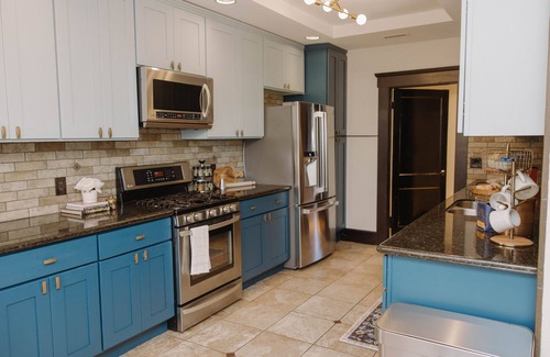 You'll love the blend of historic charm (think stained glass, built-ins, and coffered ceilings) with modern amenities like a hot tub, game room, three kitchens, and off-street parking for 5 cars.