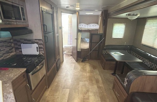 Your cozy getaway awaits in Fountain City on the backwaters of the Mississippi River. With a queen bed in the main bedroom and full size bunk beds in the back, this cabin can sleep 6 plus. There is also a couch that turns into a futon and the dinette can be converted to sleeping space as well. It comes fully stocked with bedding, kitchen and bath linens. The kitchen is also well prepared for your stay with dishes, silverware, pots and pans, knives, and anything else you might need. Come enjoy the beauty of the Mississippi in this fully stocked camper at the Drift Inn Campground.