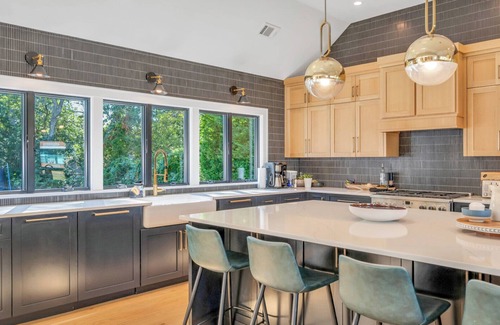 As you step inside, you are immediately welcomed by a bright and open living space that flows effortlessly from room to room. Large windows allow natural light to pour in, highlighting the modern dcor and creating a sense of warmth throughout. The heart of the home is undoubtedly the island chefs kitchen, equipped with top-of-the-line appliances that make preparing meals a joy. The spacious kitchen features a large island with ample seating, ideal for casual breakfasts or a gathering spot as dinner is prepared. A coffee maker is ready to brew your morning pick-me-up, while sleek countertops and contemporary finishes elevate the culinary space. From the kitchen, it's an easy flow to the dining room, where you can enjoy elegant meals, and the living room, where a cozy fireplace invites you to unwind after a day spent exploring the Hamptons. With its open floor plan, the living space feels connected yet distinct, offering multiple areas to relax, work, or entertain. Whether youre enjoying a movie night in the comfortable living room or setting up a workspace in a quiet corner, the home is designed to meet the needs of sophisticated travelers. Modern finishes and tasteful dcor can be found throughout, enhancing every corner of this stylish retreat.