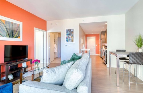 A beautiful 811 sq. ft. one-bedroom apartment with an orange accent wall, floor-to-ceiling windows, and great views.