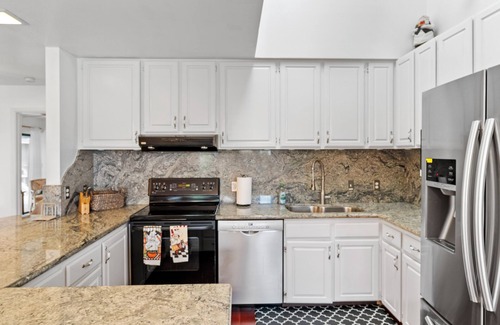 The kitchen and formal dining area has granite countertops, an electric range, microwave oven, a Bosh dishwasher and GE refrigerator. The kitchen is fully stocked with pots, pans, glass wear, cooking utensils, food processor, rice cooker, waffle maker, Instant Pot, Keurig Coffee maker, baking wear, a Kitchen Aid mixer and lots of baking supplies as well. There is a breakfast table for 4 or a larger table next to the wall to wall windows that can seat 8. The kitchen has vaulted ceilings with multiple lighting options. The flooring is Brazilian Cherry.