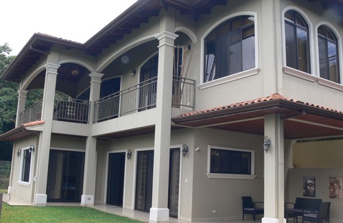 This spacious two-story home is located in a popular and secure gated community close to the center of Atenas. It sits on a large property and is built against the hillside, offering a great views from all of the rooms of the house.