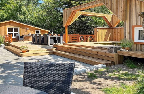 Unique holiday home on a large plot with room for a large family or several families together. The plot is 2850 m2 and is extremely spacious and well-appointed. The plot offers fjord views and the opportunity to enjoy the sun from several different terraces and nooks. The garden and terrace behind the house are fenced for the enjoyment of younger guests and four-legged friends. The garden also has a large trampoline and swing set with a tyre swing, baby swing and sensory swing (use the trampoline and swing set at your own risk and insurance). There is a new petanque court built in 2025. Approx. 250 m2 of new paved terraces and a large wooden terrace. Plenty of tables, garden chairs and two sun loungers. There's also a sandpit and a cave for the kids. New 7-person outdoor spa and activity room with table tennis, billiards, table football and darts. There is also a treadmill and rowing machine. The holiday home was built in 1997 and has been continuously renovated, most recently the floor plan was thoroughly modernised in 2022. The layout of the house is ideal for large families or if you are travelling together. The house entrance can be accessed from the front of the house or the back by the large terrace. There's plenty of space for shoes and jackets, as well as access to a practical storage room/utility room. At the heart of the house is the large living room in open connection with the spacious and well-equipped kitchen. The living room also has a wood-burning stove and a TV with Chromecast for streaming your own services. The house also has another lovely living room with a sofa and TV with Chromecast. The rooms are distributed with one bedroom at the end of the living room with its ‘own’ entrance. The room has a double bed. At the other end of the house, together with the smaller living room, there are two spacious bedrooms and a smaller walk-through room with a single bed. One room has a double bed and cot, and the other has a double bed and bunk bed. The last beds can be found in the modern annex of the house, with two double bedrooms and space for creative expression or workspace. There's also a TV with Chromecast for your own services. The holiday home also has two nice bathrooms with showers. You'll find this holiday home in Lynderup - very close to the local golf course. The area is nice and quiet, inviting you to many good experiences on walks and the like. Not for hire for craftsmen and youth groups.A refundable deposit might be charged closer to your check-in date. The security deposit ensures a smooth stay and covers any additional services or consumption charges.This deposit covers utilities consumed during your stay and any additional services that may be taken.The final amount will be adjusted based on actual meter readings, actual usage of extra services, and any remaining balance will be refunded within 21 days after checkout.This deposit simply acts as a prepayment for charges that you would anyways pay for, ensuring a seamless stay and check-out experience.