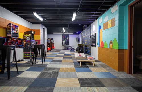 Welcome to The Arcade House, with over 2300 sq ft of space for you to spread out and have fun. This includes two large bedrooms with king sized beds and another bedroom with a queen sized bed. Large newly remodeled kitchen with coffee bar. Downstairs you’ll find a large family room/bedroom area with arcade machines, a pinball machine, gaming system, oversized connect 4, record player, 2 sets of bunk beds and a futon couch. Several fun wall murals and selfie ops throughout the home.