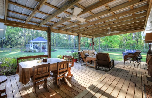 The covered front porch and spacious covered back patio have ample seating, which creates the perfect setup for hours of playing games together, watching sports, or just visiting with loved ones. There is a professional, full-size gas/charcoal grill to make BBQing a breeze. The fenced in backyard allows for kids and pets to safely roam and play while not being able to wander off into the surrounding woods. Our gazebo, wired to be able to support a full band also has a sun deck on the uncovered top tier. And take it from us, belting out your favorite tunes will not result in disgruntled neighbors. The trees do a wonderful job of muffling your fun.