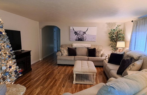 Our home is perfect for your next group adventure, or family get away! Offering a cozy living room with brand new furniture to seat 12 comfortably, a 55" flat screen smart TV above the electric fireplace is the center of the home.