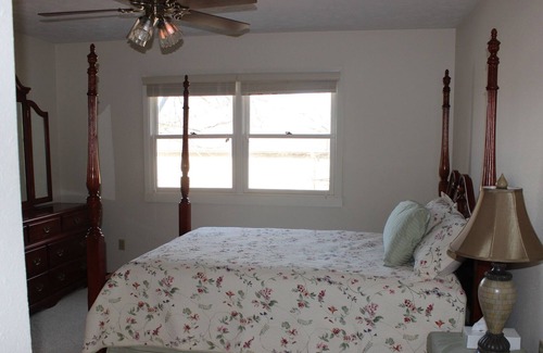 The neighbors say that this was "The General's House." It is a beautiful, peaceful space for a quiet weekend. It is a wonderful place to listen to music, read, watch movies and play games. The main level includes a living room, hearth room, dining room, breakfast room, powder room, kitchen, office and Master bedroom and bath. The Master bedroom, dining room, breakfast room and sun room/office all have views of the forest. Upstairs are three bedrooms with queen beds. The upstairs bedrooms share one bath. Wild turkeys forage, chase each other like kids at a middle school dance, and roost in the trees as evening falls. Deer stroll the neighborhood and take afternoon naps in full sight from the house. Lately a fox has been seen crossing the hillside. The neighbor saw the turkeys form a group and face the fox down. Step outside in the evening and you may hear barred owls or barn owls chuckling and hoot-hooting.