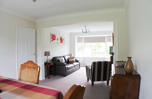 Spacious & light front facing lounge with leather sofa, chair, flat screen tv, board games, jigsaws.