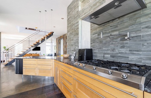 The villa features five beautifully appointed bedrooms, each with a private balcony overlooking the lake and mountains, ensuring a restful and scenic retreat. A large loft area provides additional sleeping and lounging space, perfect for families or groups. The open-concept living and dining areas create a warm and inviting relaxing space. At the same time, the gourmet kitchen, equipped with top-of-the-line Gaggenau appliances, is a chef’s dream for preparing meals or entertaining guests.