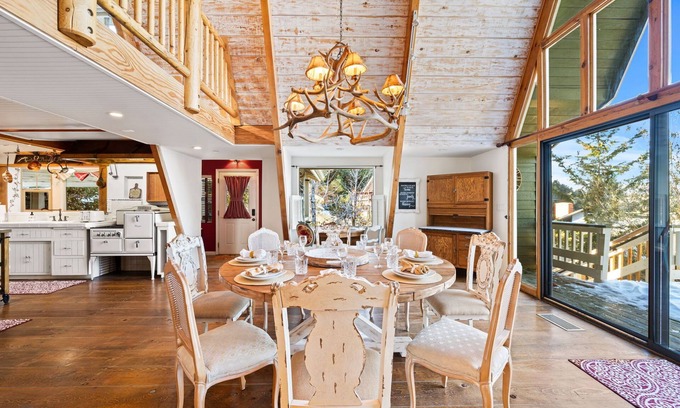ORIGINAL A-FRAME RESTORED/RECONSTRUCTED- Mountain High Manor's craftsman front porch welcomes you into the original wing of the estate; a meticulously reconstructed A-Frame featuring a 2-story dining area with a wall of windows restored to its original charm of 1962 including an antique kitchen stove as a decorative centerpiece beneath a massive hammered copper chimney vent.