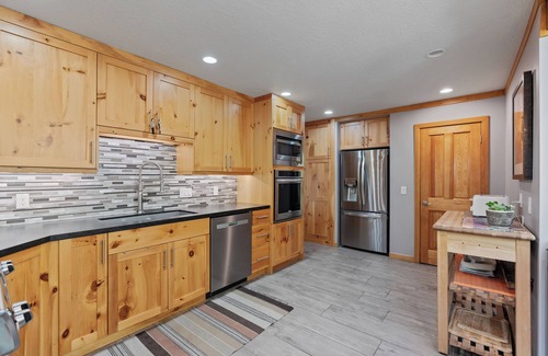 This colorful two-story house offers room to spread out and enjoy every part of your day, whether working from home, hitting the slopes, or relaxing. It has four bedrooms and three full bathrooms, with flexible spaces that work for groups, families, or long-term stays. The home even has an elevator, so getting between floors is easy for everyone.