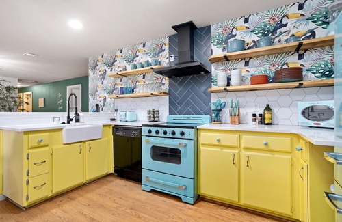 Make some memories at this unique and family-friendly place. These jungle and beach houses have exciting themes throughout, guaranteed to put a smile on the faces of your party or family. Comfortable beds to sleep soundly at night and a large sectional in the TV room to stream your favorite shows. You’ll have access to a private pool, ample outdoor seating to enjoy cocktails, a small fire pit, and a jungle gym with swings for the kids. The perfect getaway from the city or family/friend vacation.