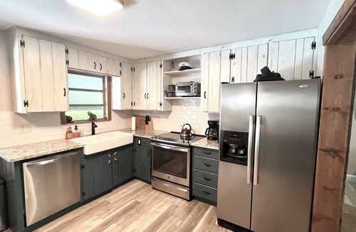 Come stay at "The Lodge". This home was recently renovated and themed after a Safari Lodge. There are 3 bedrooms and 2 full bathrooms along with a covered patio and a private screened in pool. The home sits on over an acre and has a private firepit area and a sitting area overlooking the fenced in back yard. There is a ping pong table and several bikes that can be used for the nearby bike trails or to ride downtown. The property sits near a city park, dog park and walking trails. There are lake views from the pool deck. The property has ample parking for RVs, boats or several cars.