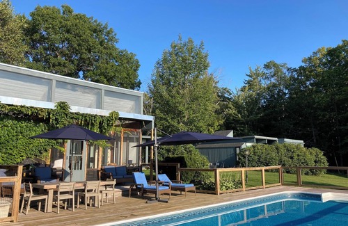 Our one-of-a-kind, light-filled midcentury modern home offers all the space you need for you and your guests to come together or spread out. Enjoy hilltop views of our working farm while you lounge by the pool in the summer, or gather in the cozy unique sunken living room in the winter. With a ping pong table, a well-equipped gym, a large open-concept kitchen, and a bright and airy office for when duty calls, this house has something for everyone in the group. We're always happy to show guests what we're doing around the farm, or point you to the local trails and recreational opportunities.