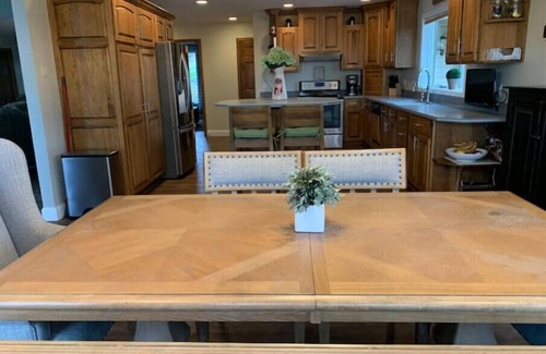 Enjoy a peaceful stay at this private, cheerful house right on the Fox River. Plentiful parking and magnificent sunsets! This spacious home sleeps 14 guests comfortably. You'll love fishing off the docks next to a unique fire pit area with ample seating and counterspace. Throw a kayak in and float to a restaurant or hop in your UTV and go grab a bite. Large yard is perfect for provided lawn games. Quiet country roads perfect for a jog.