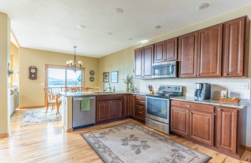 The open, main floor interior is designed with group gathering in mind, featuring an inviting Great Room boasting soaring cathedral ceilings and panoramic lake views. After a day of adventure, relax on one of the sofas and unwind with shows or movies on the smart TV. The spacious full kitchen comes well-equipped with major, stainless steel appliances including a dishwasher for easy at-home meal planning. There's seating for two at the breakfast bar and the dining table is set for six.