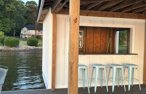 Located on a 1-acre point lot overlooking the Main Lake, you'll have plenty of space for outdoor games when you need a break from the water. The newly rebuilt double boathouse is open for your boat or jet skis, and the dock includes a sundeck and outdoor table. You can find public boat docks to drop your boat in (http://www.lakegastonguide.com/?q=node/1378).