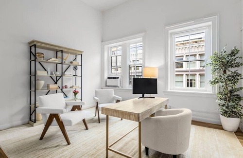 This penthouse loft offers two bedrooms, a sizable kitchen and dining area, a washer-dryer, and more. Complete with designer furniture, blazing-fast wifi, and dedicated workspace, this home provides a perfect space for guests to work and live. The unit also offers ample closet space and a fully-stocked kitchen.