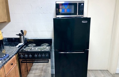 The kitchen is a harmonious blend of modern functionality and classic charm. Equipped with modern appliances, it invites culinary enthusiasts to whip up delicious meals while surrounded by the historic charm of the church's original features. Here you'll find an apartment sized four burner electric stove with oven, a refrigerator with freezer, toaster/convection oven, kettle for tea, a Keurig for single brew cups or carafes of coffee, and flavored coffee syrups to customize your brew.