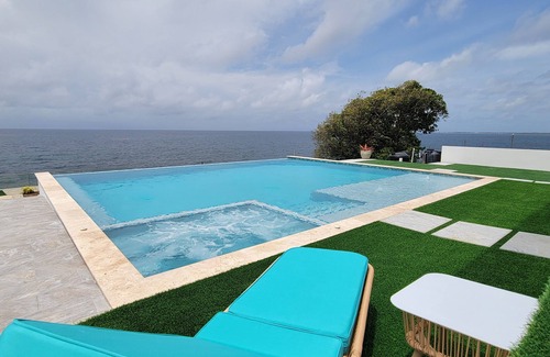 This two-storey villa features four ensuite bedrooms, two fully equipped kitchens, stylish living areas, and breathtaking ocean views from every corner.