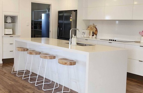 4 Bedrooms, 2 bathrooms, WiFi, Double lock up garage and under house carport. Electric cooking, fully self contained holiday home with the Coffee Pod machine. 2 Large fridges in the kitchen and the huge walk in pantry. All bedrooms are airconditioned. Lounge suite with charger ports on the sides. Smart TV to watch your favorites, or sitting on the verandah with a book and take in the ocean view.